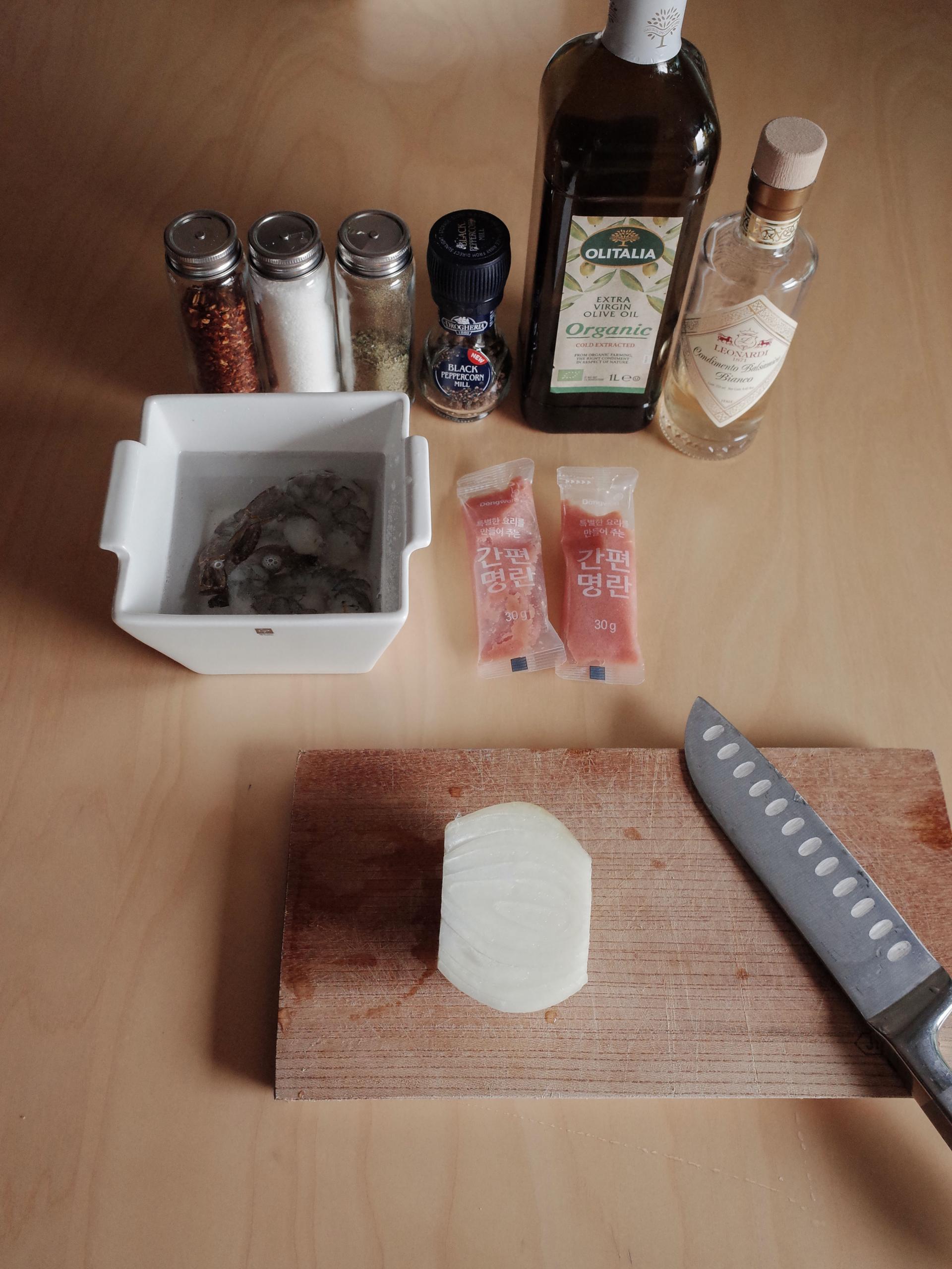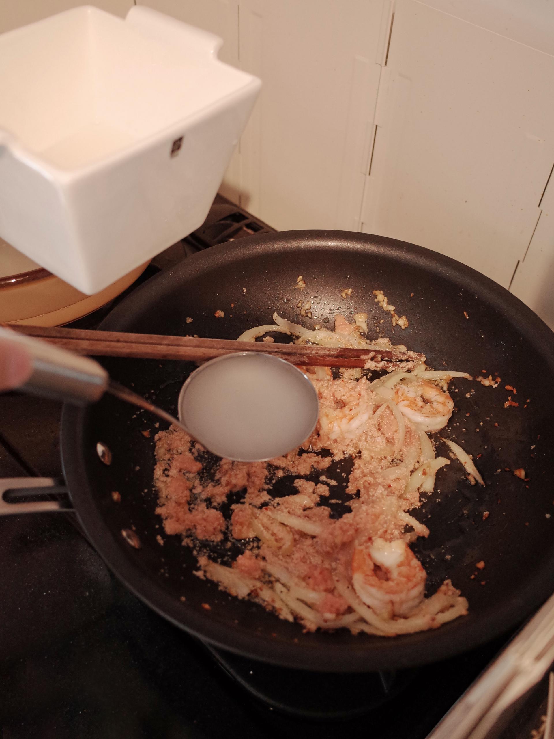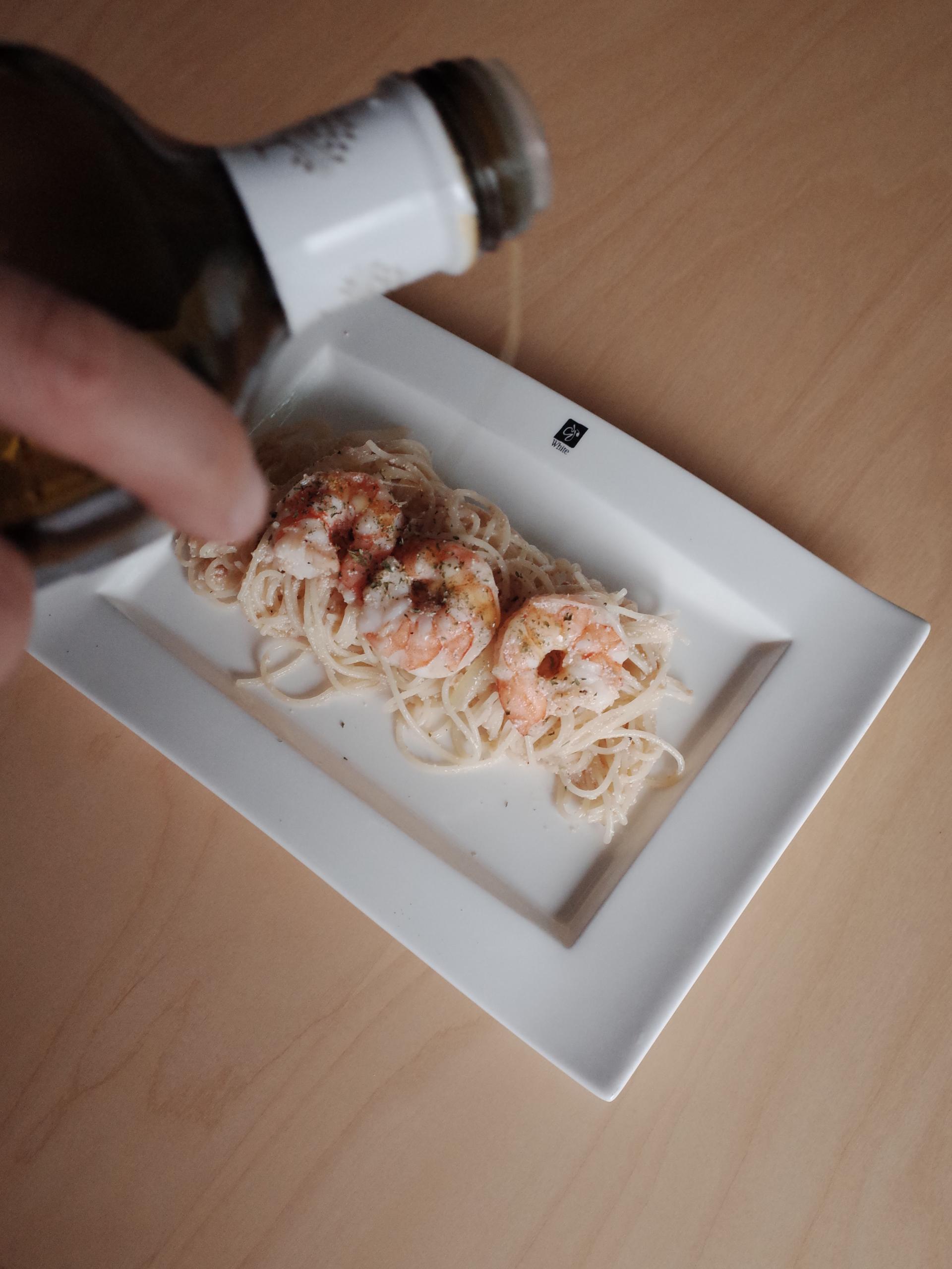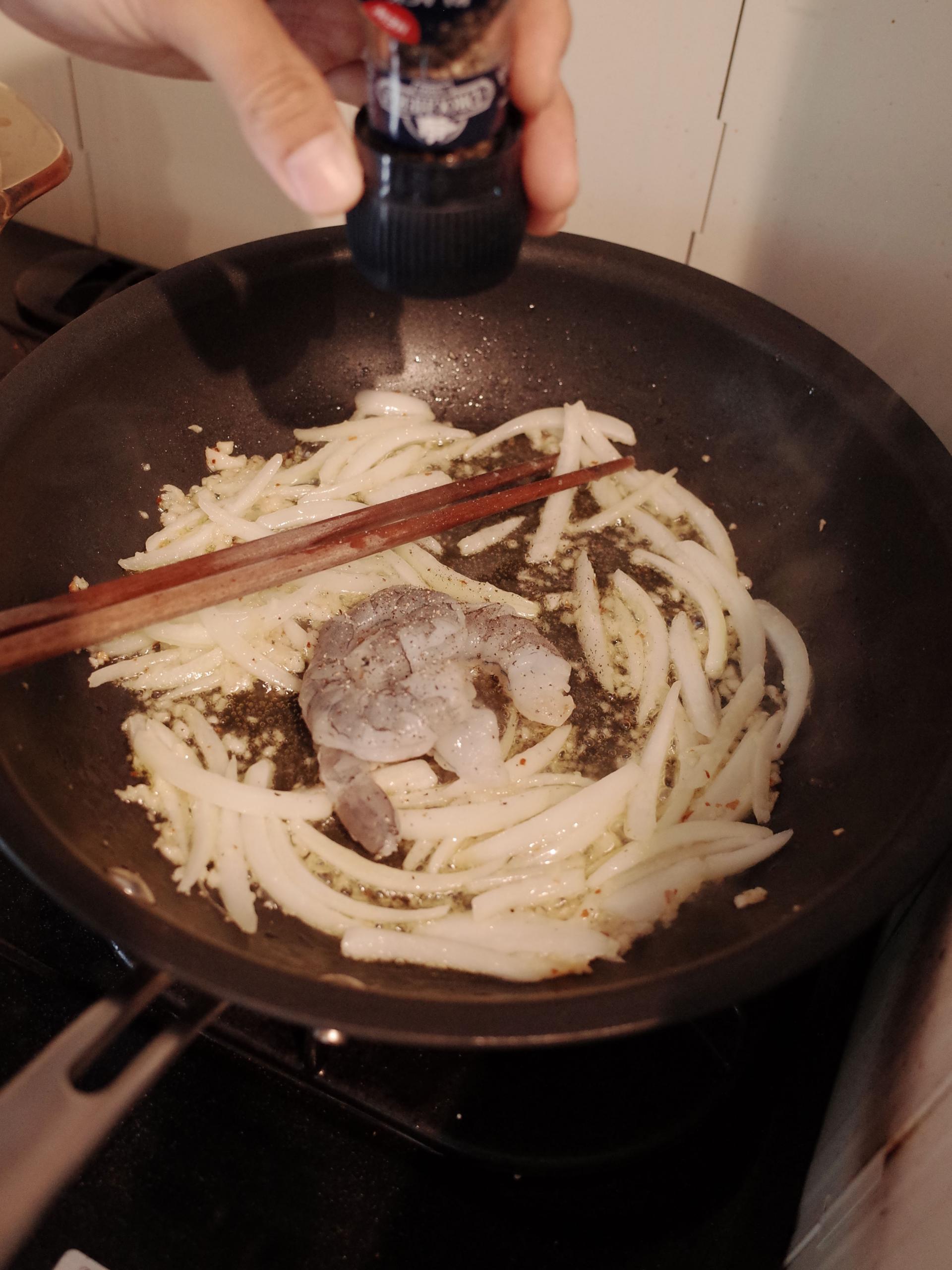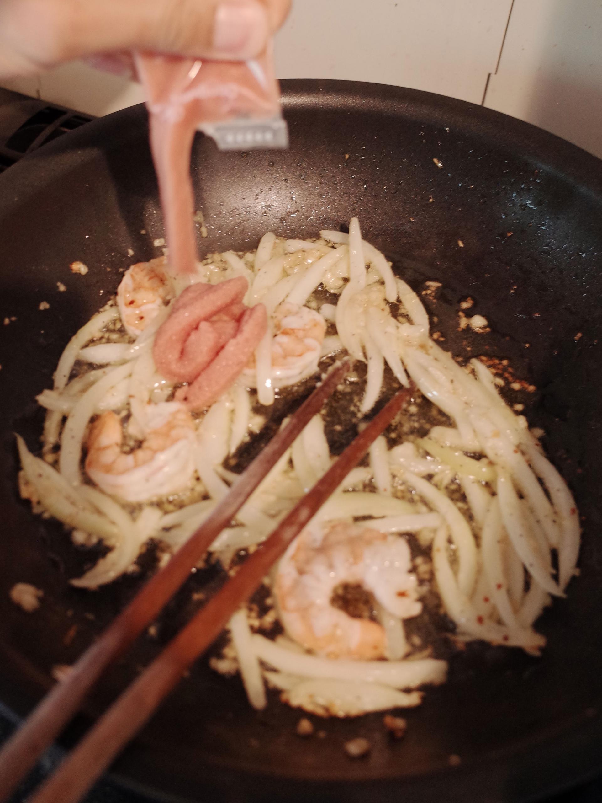 7. 새우를 넣고 후추를 뿌려주세요.