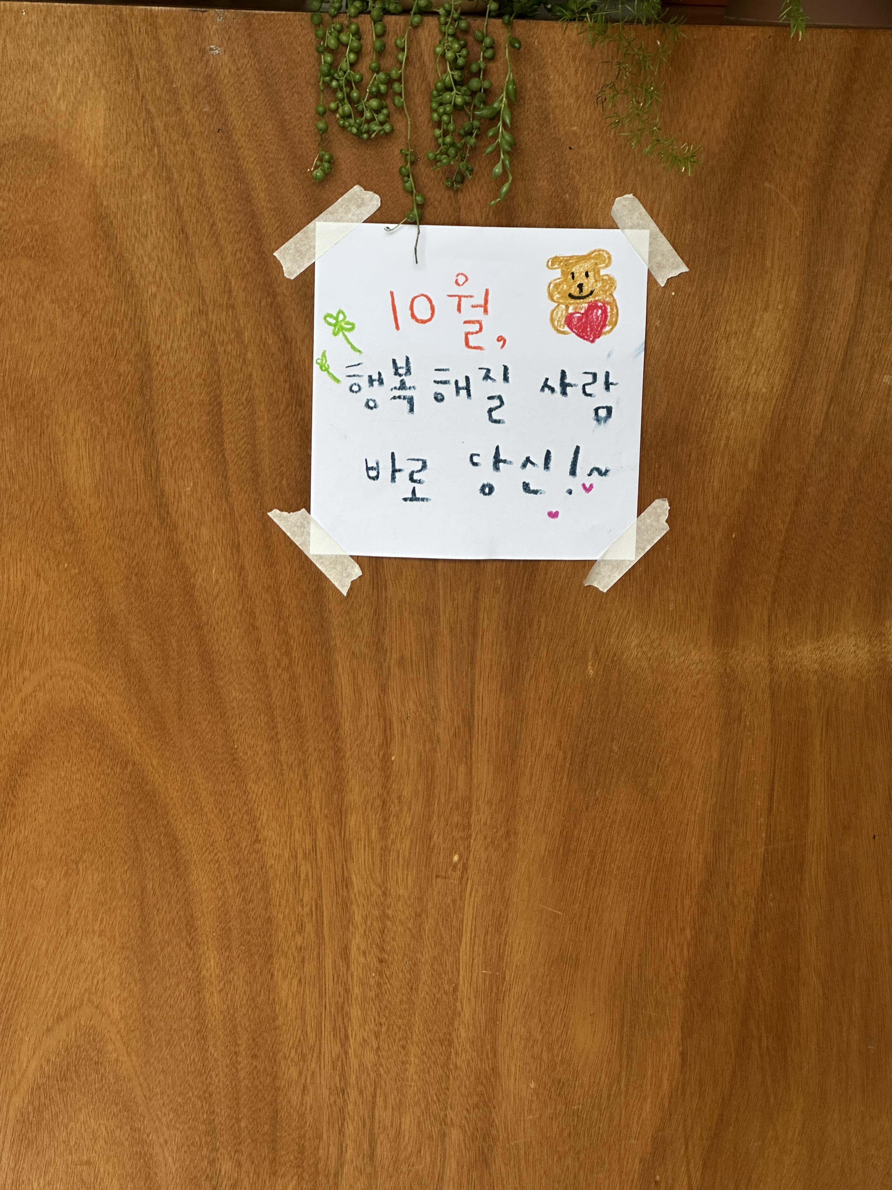 카페에 들어서자마자 작은 종이 한 장이 반겨주더라고요. 크레파스로 꾹꾹 눌러쓴 글씨, 귀엽게 웃고 있는 곰돌이, 그리고 글 한 마디!
