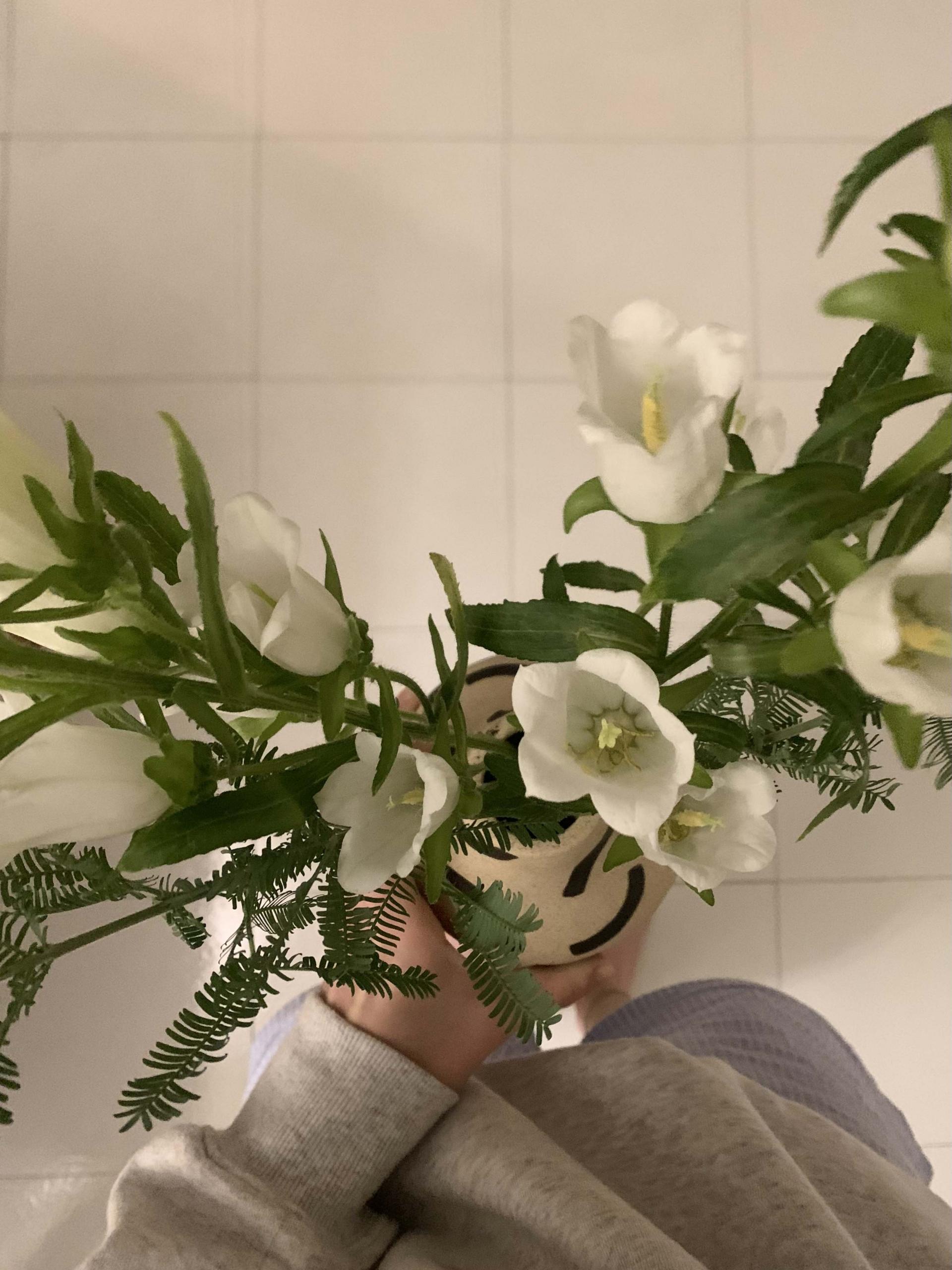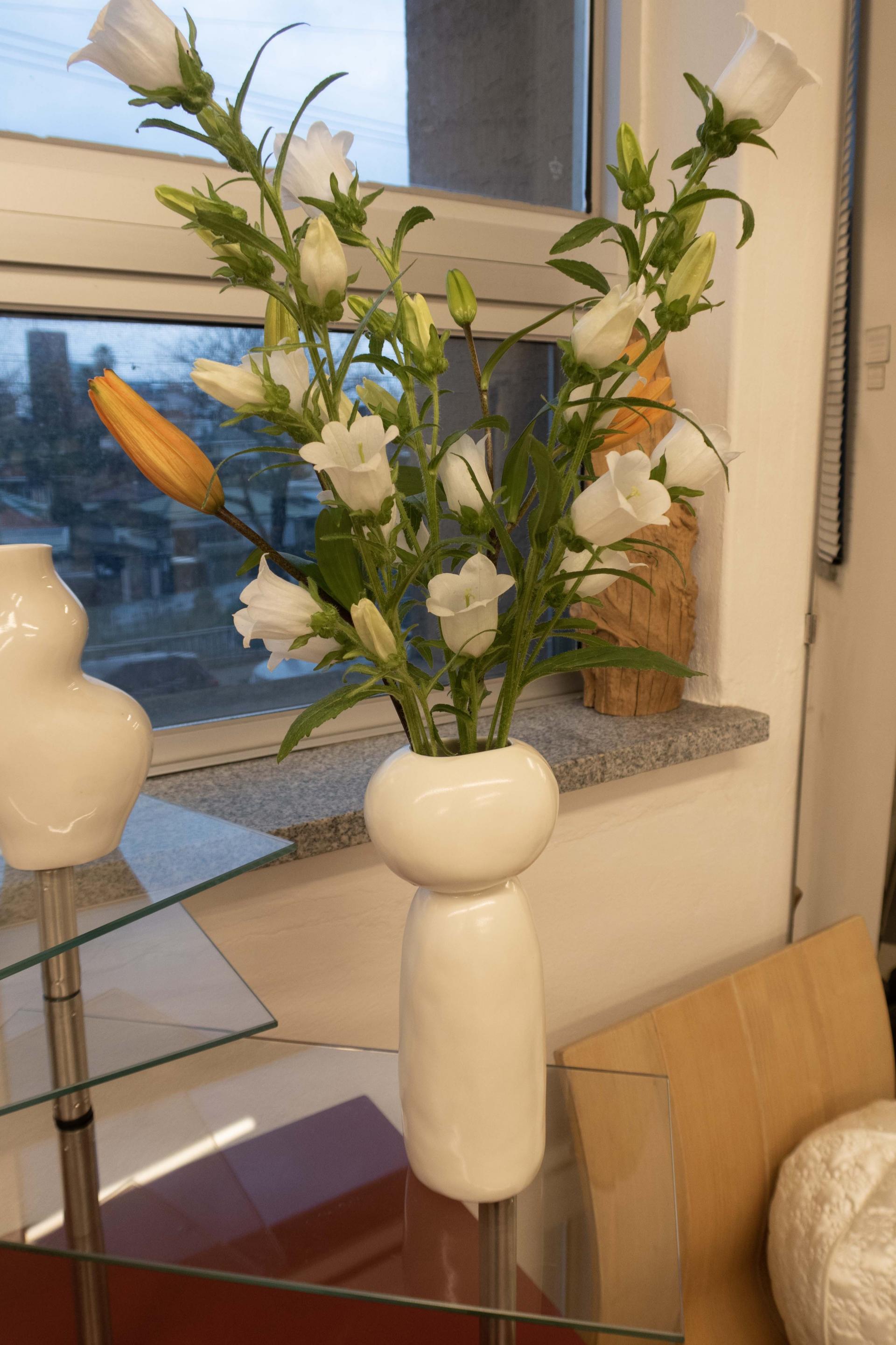 조약돌을 닮은 모누앤드의 화병에는 하얀 캄파눌라를 꽂아두었어요.