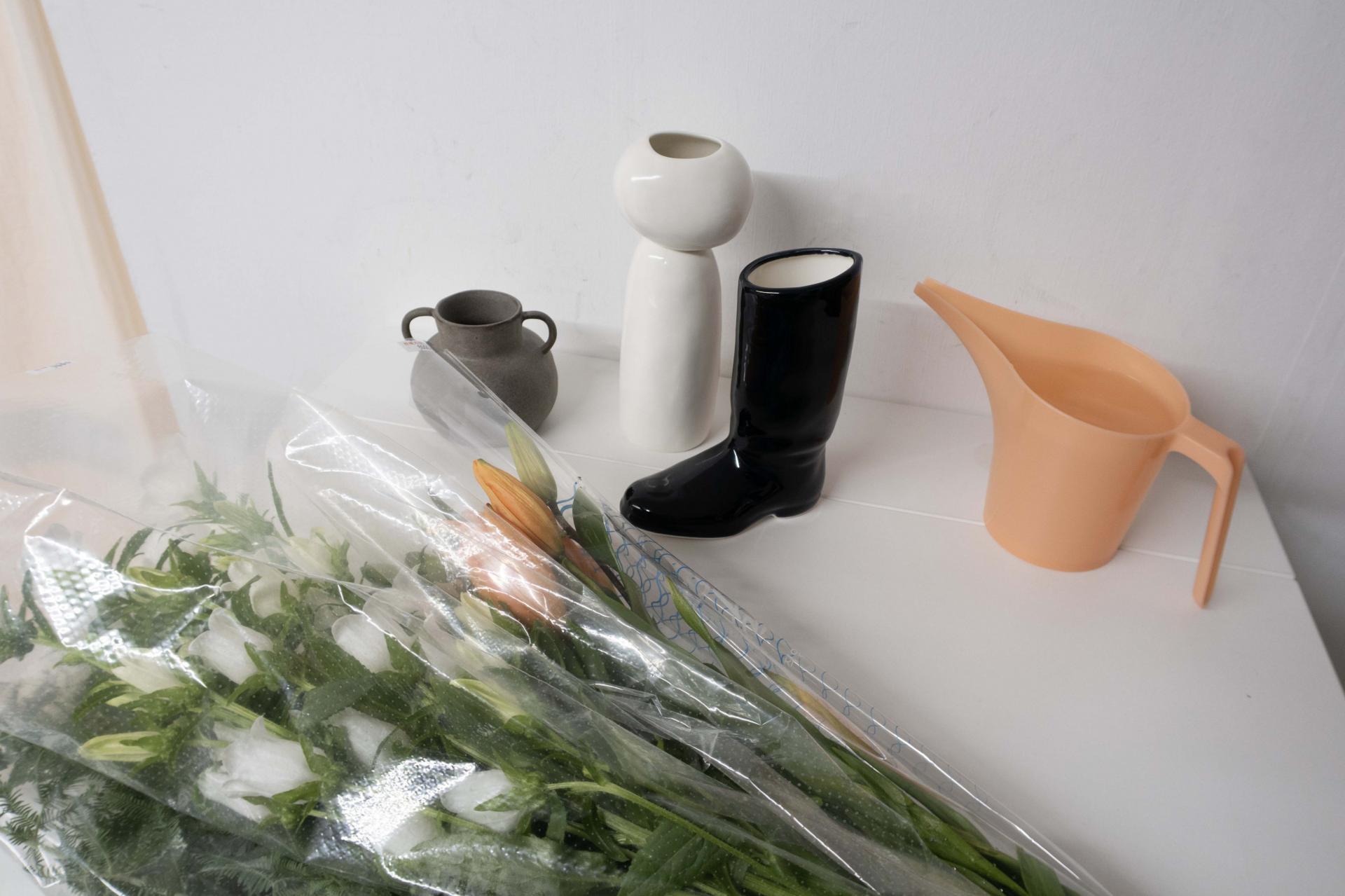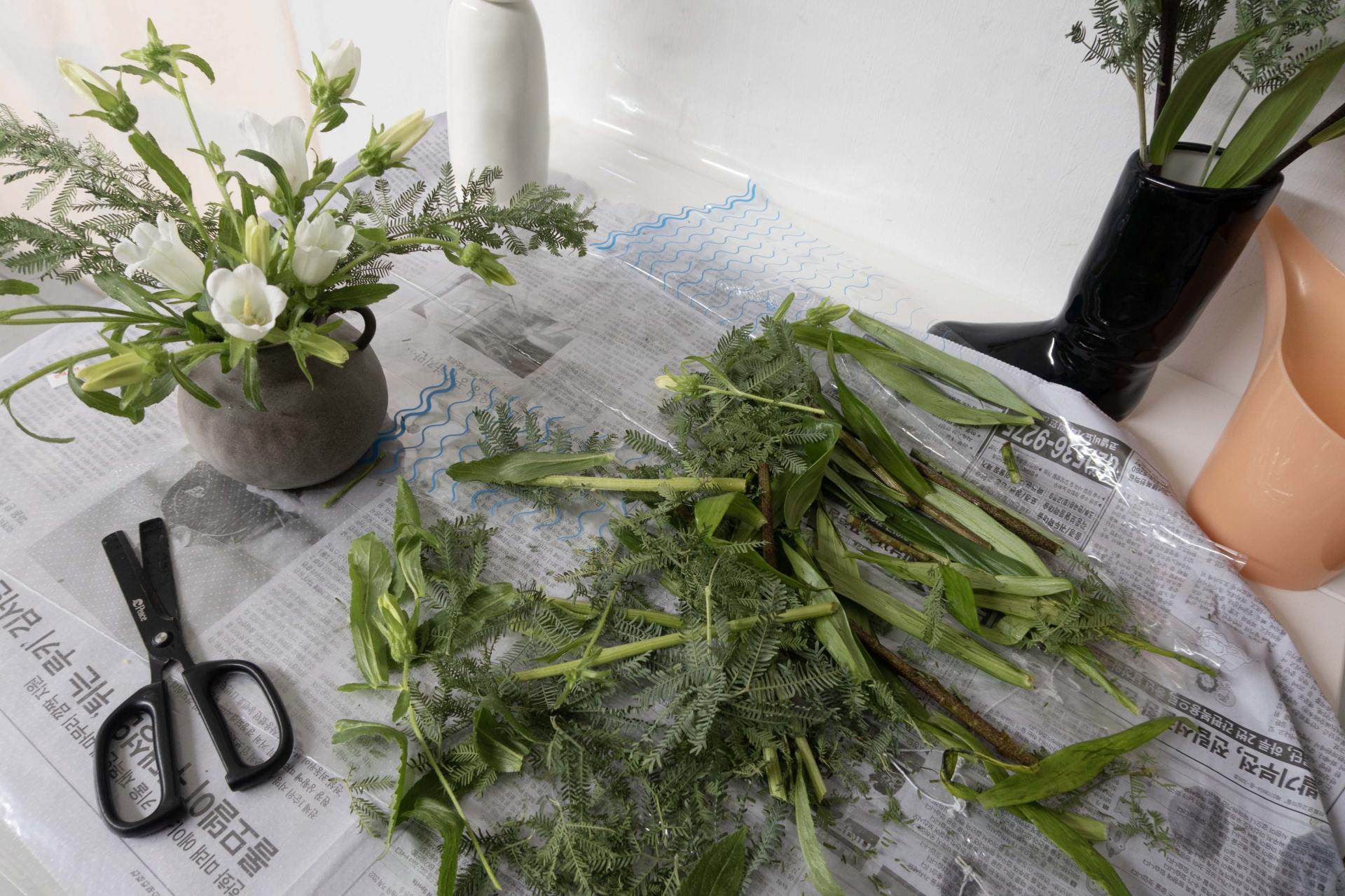 꽃을 다듬기 전 식물을 꽂아둘 화병을 준비해요.