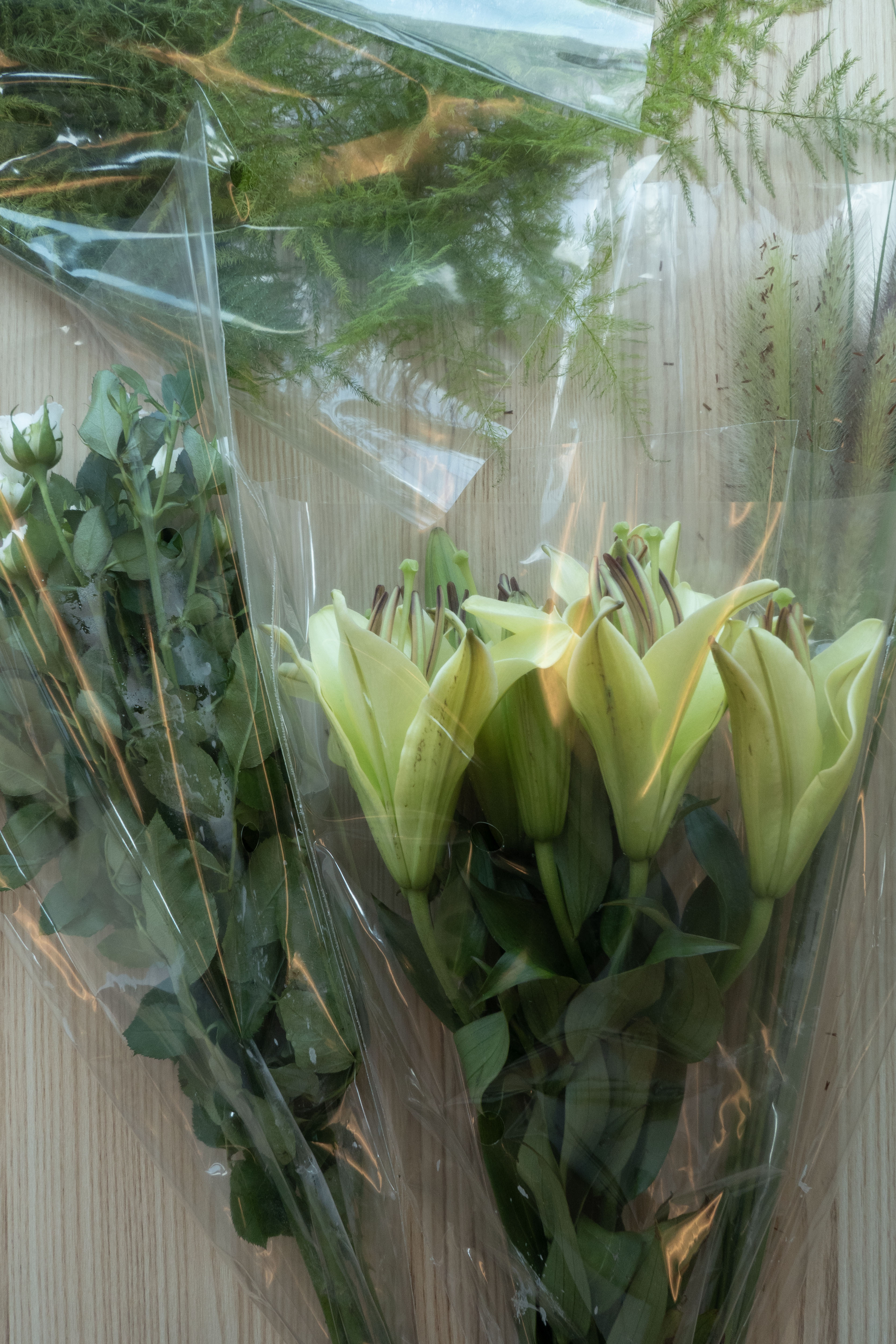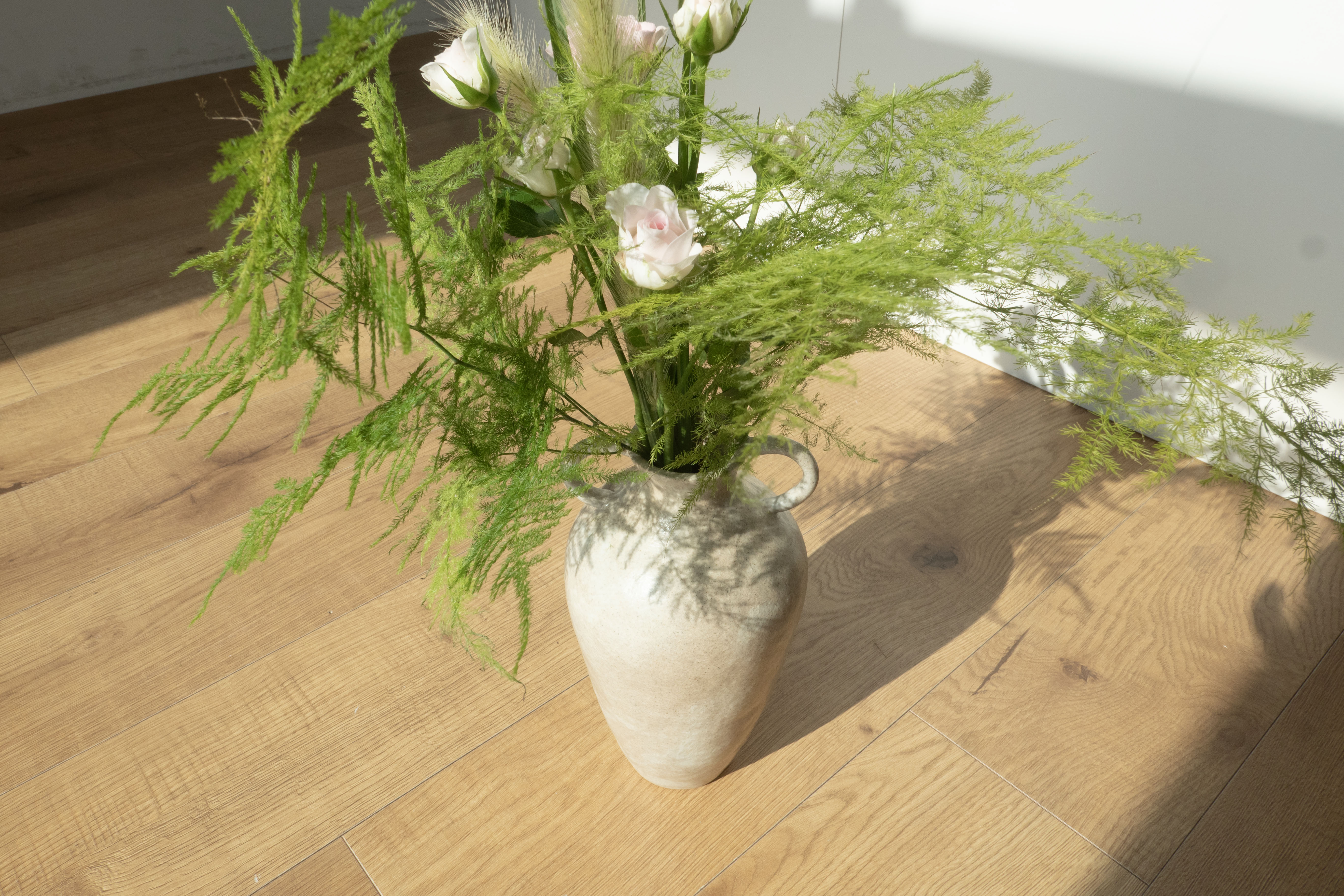 흐드러지는 아스파라거스와 분홍색 장미를 차분한 톤의 화병과 매치하니 부케처럼 우아한 분위기를 만들어주더라고요.