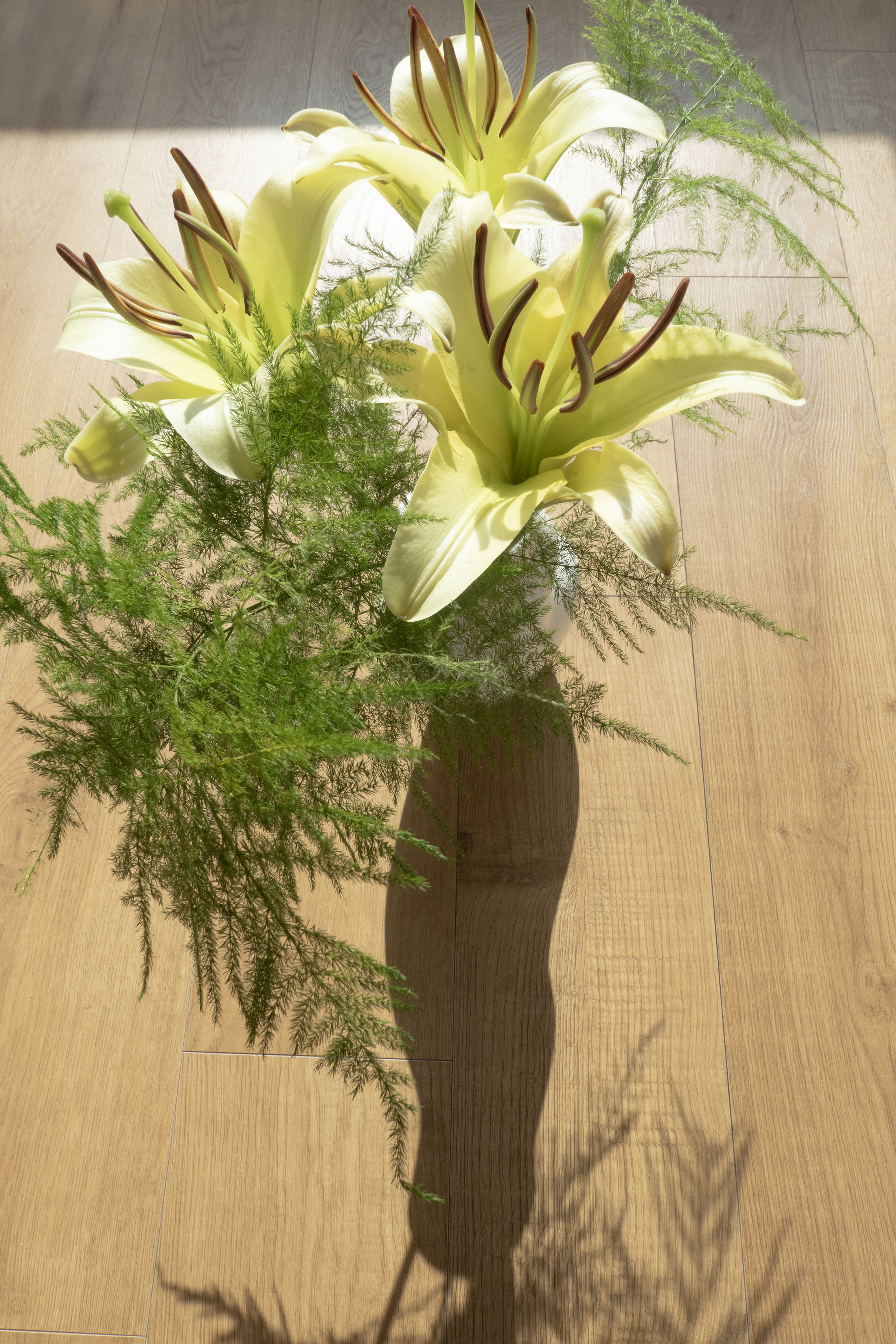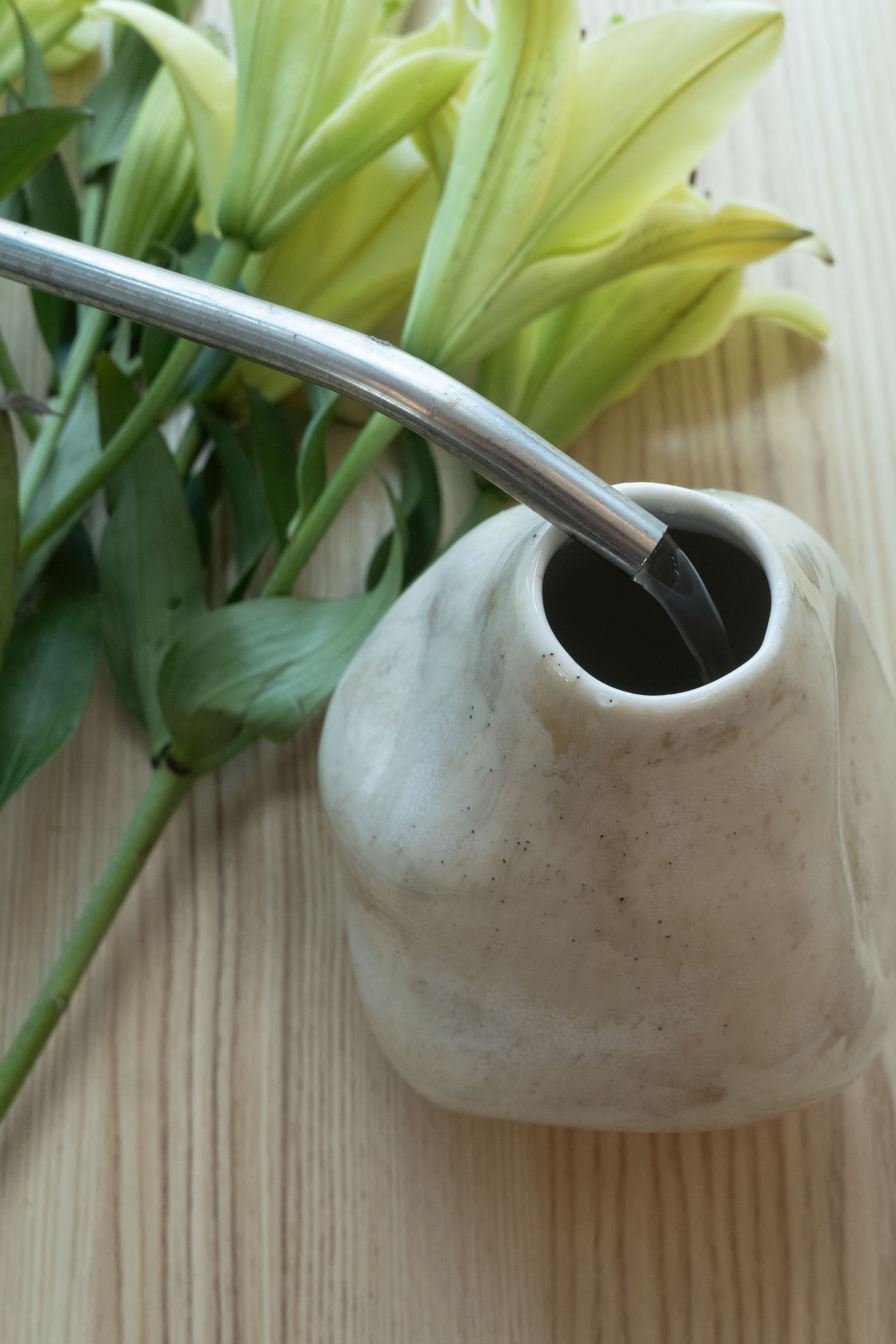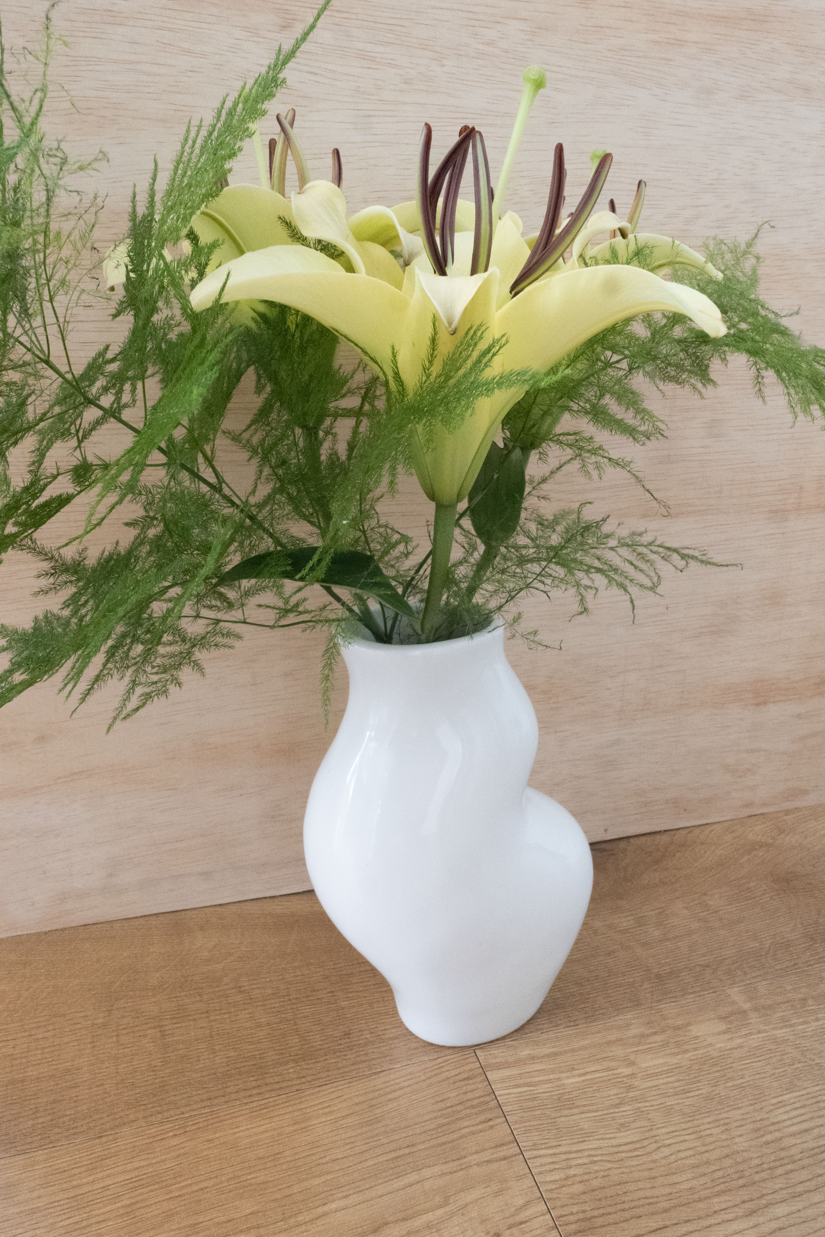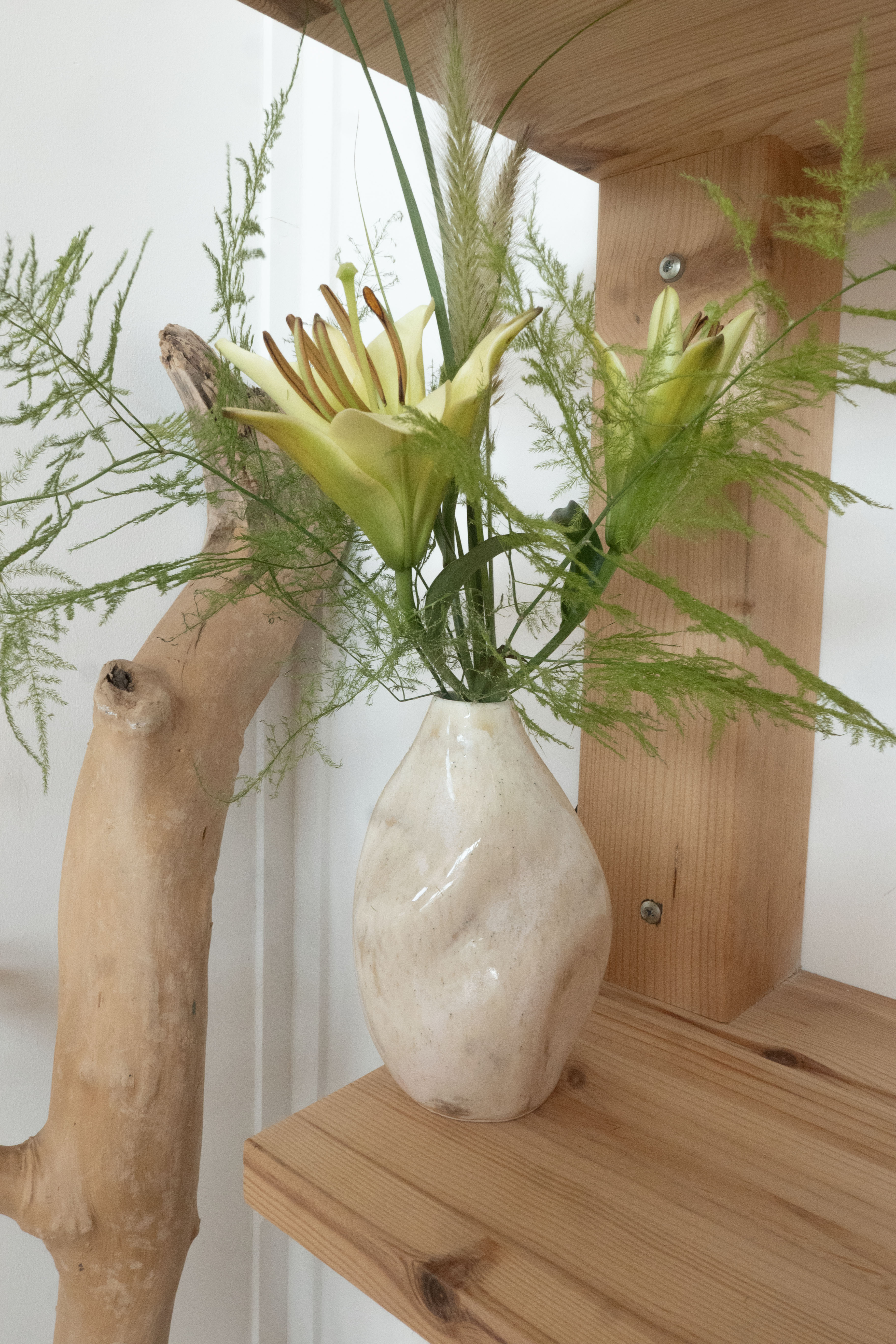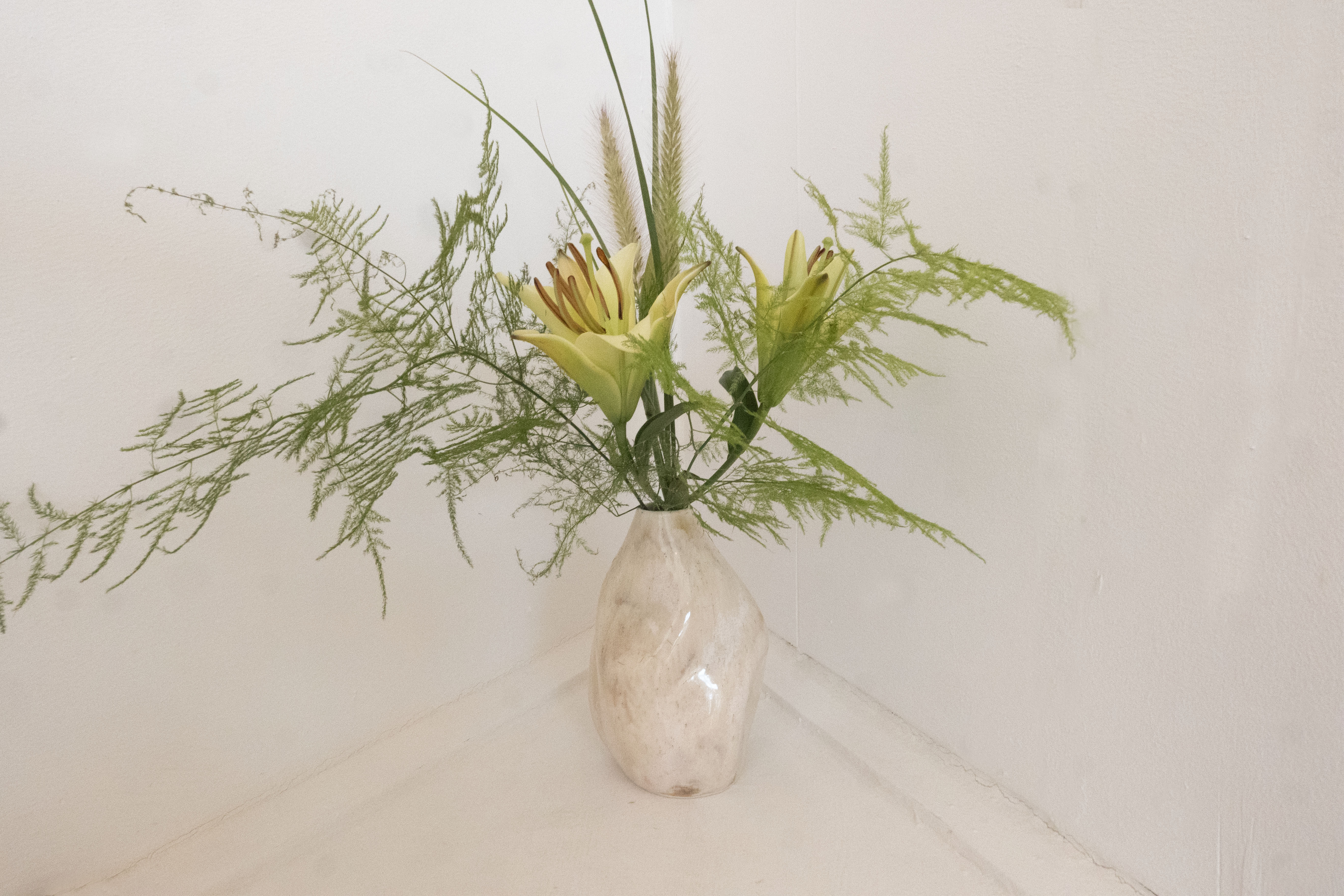 입구가 좁고 은은한 베이지 톤을 지닌 Wave Vase에는 백합과 팜파스 그라스, 아스파라거스를 담아 풍성하게 피어나듯이 꽂아보았어요.