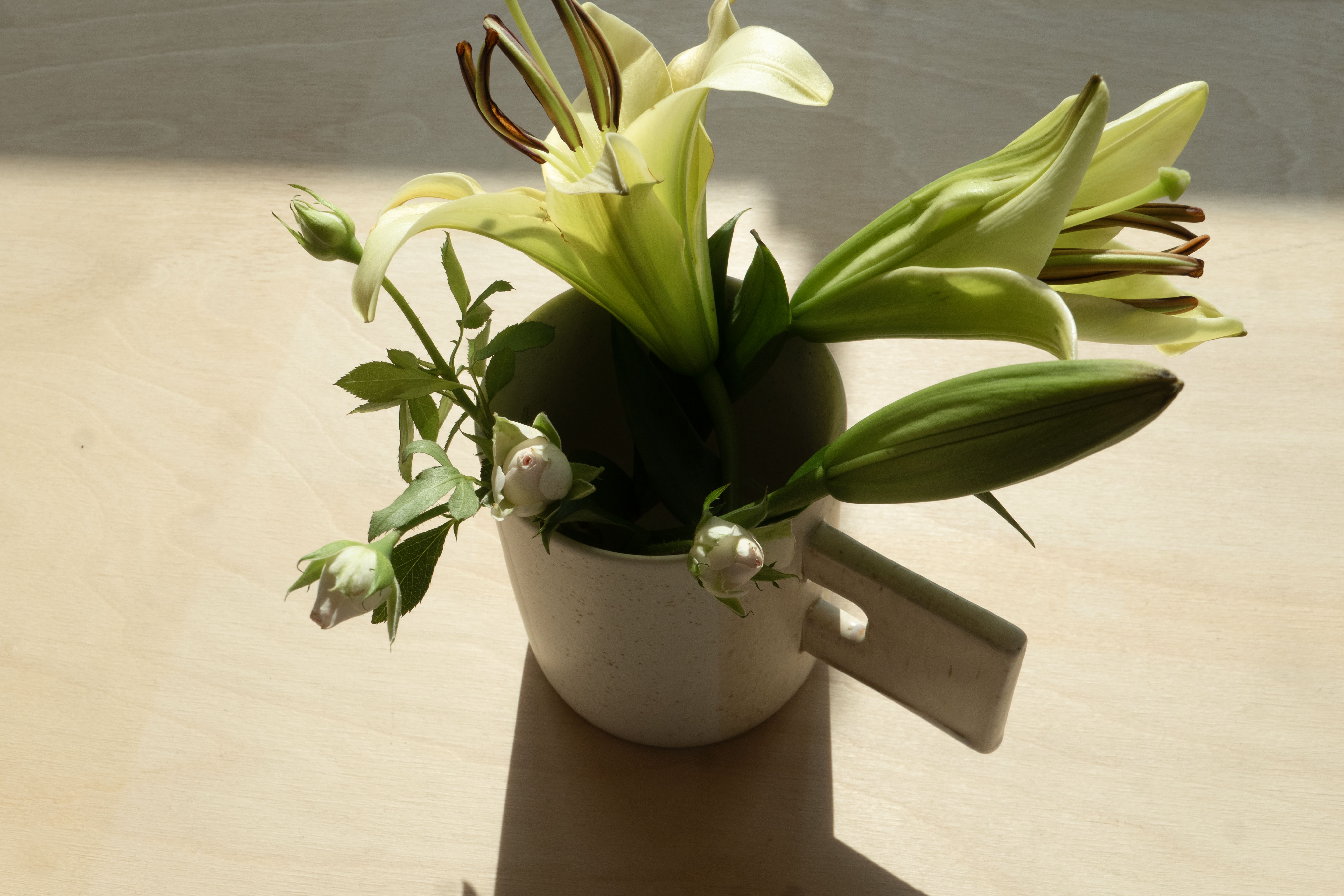 꽃을 정리하며 뜯기거나 남은 꽃은 버리지 않고 머그컵에 담아내요.