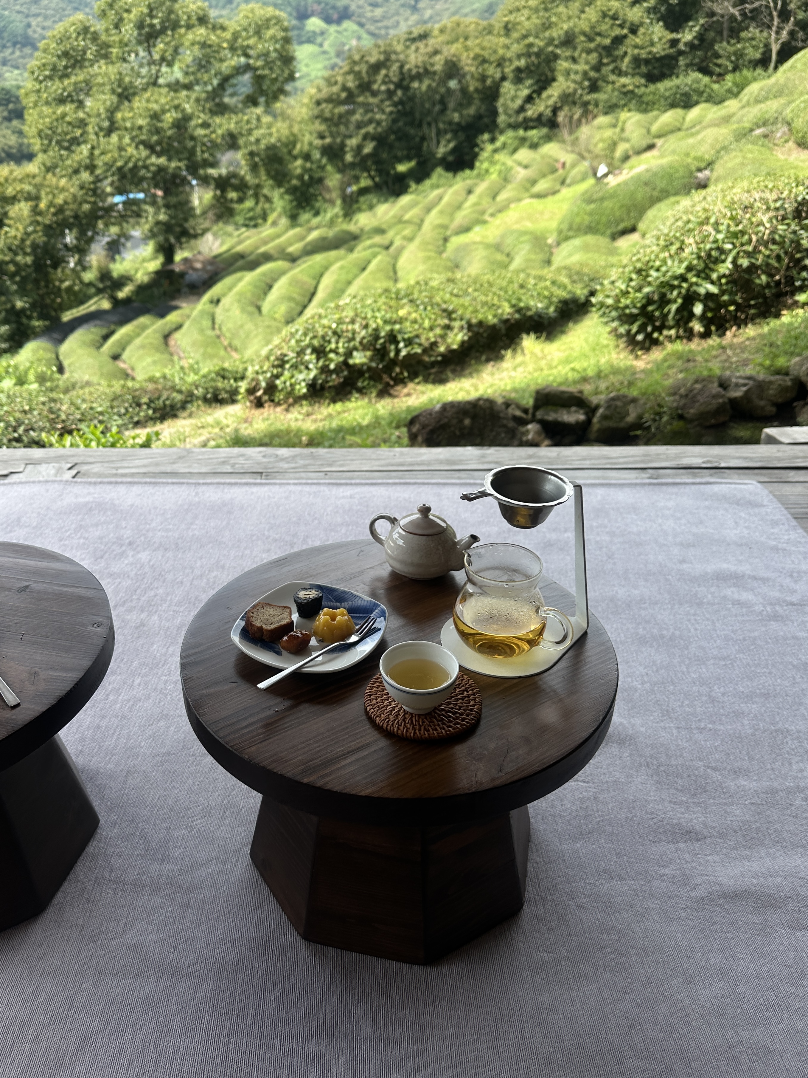 그중에서도 마지막 날, 툇마루에 앉아 녹차밭을 바라보며 차 한 잔을 마셨던 순간이 가장 기억에 남아요.