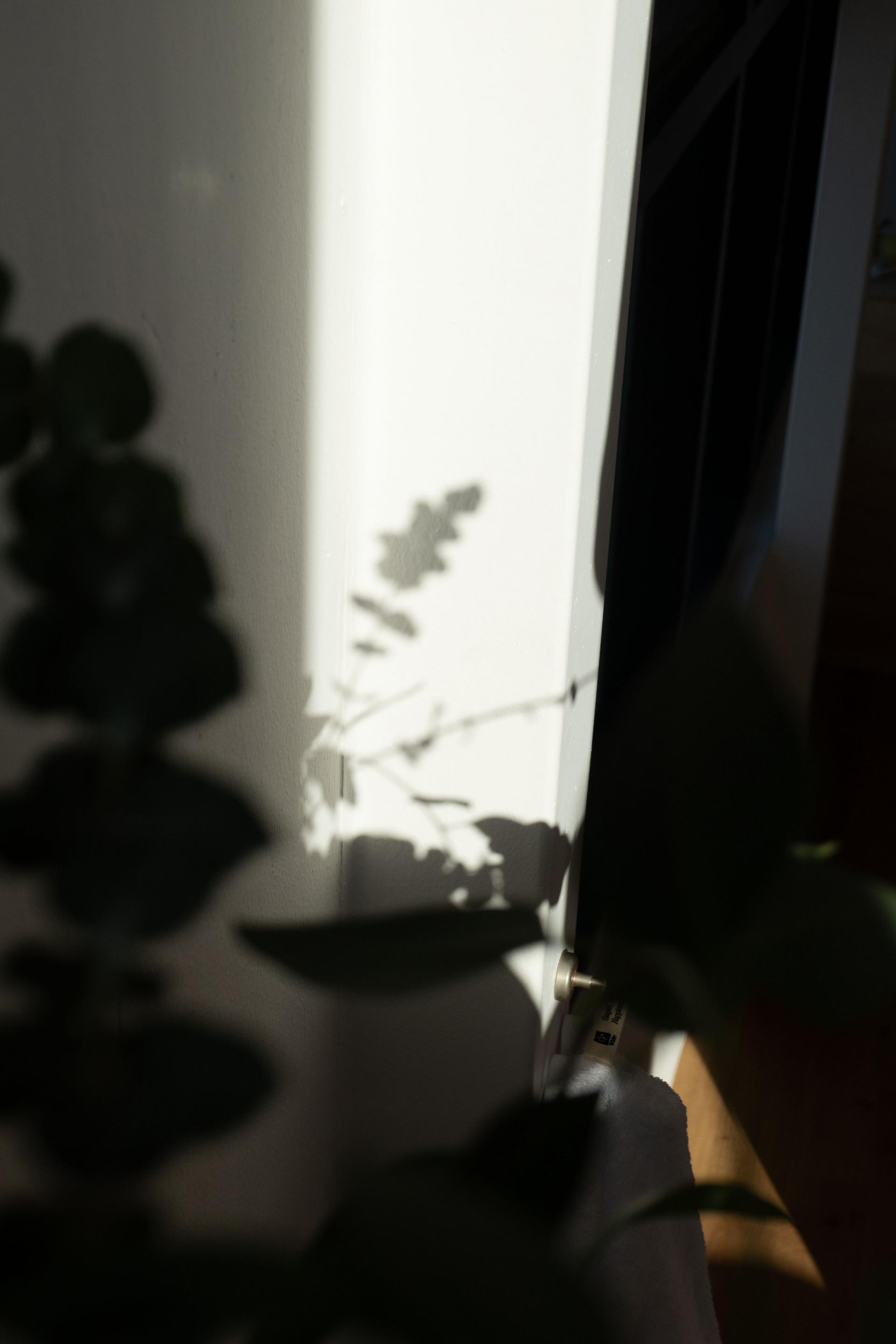 오후 4시쯤, 창가로 스며드는 햇빛에 유칼립투스의 그림자가 일렁이며 공간이 더 부드러워졌어요.