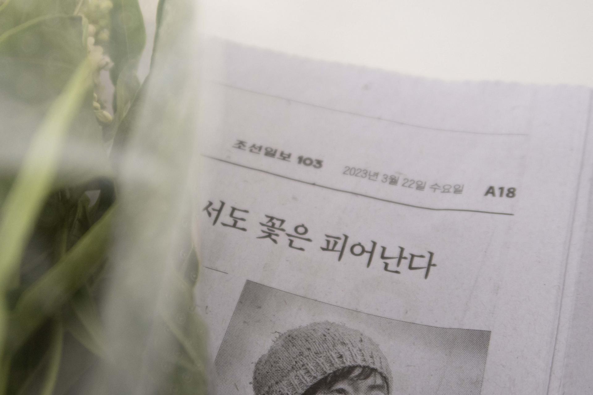 꽃을 정리하려는데 감싸주신 신문지에서 귀여운 문구를 발견했어요.