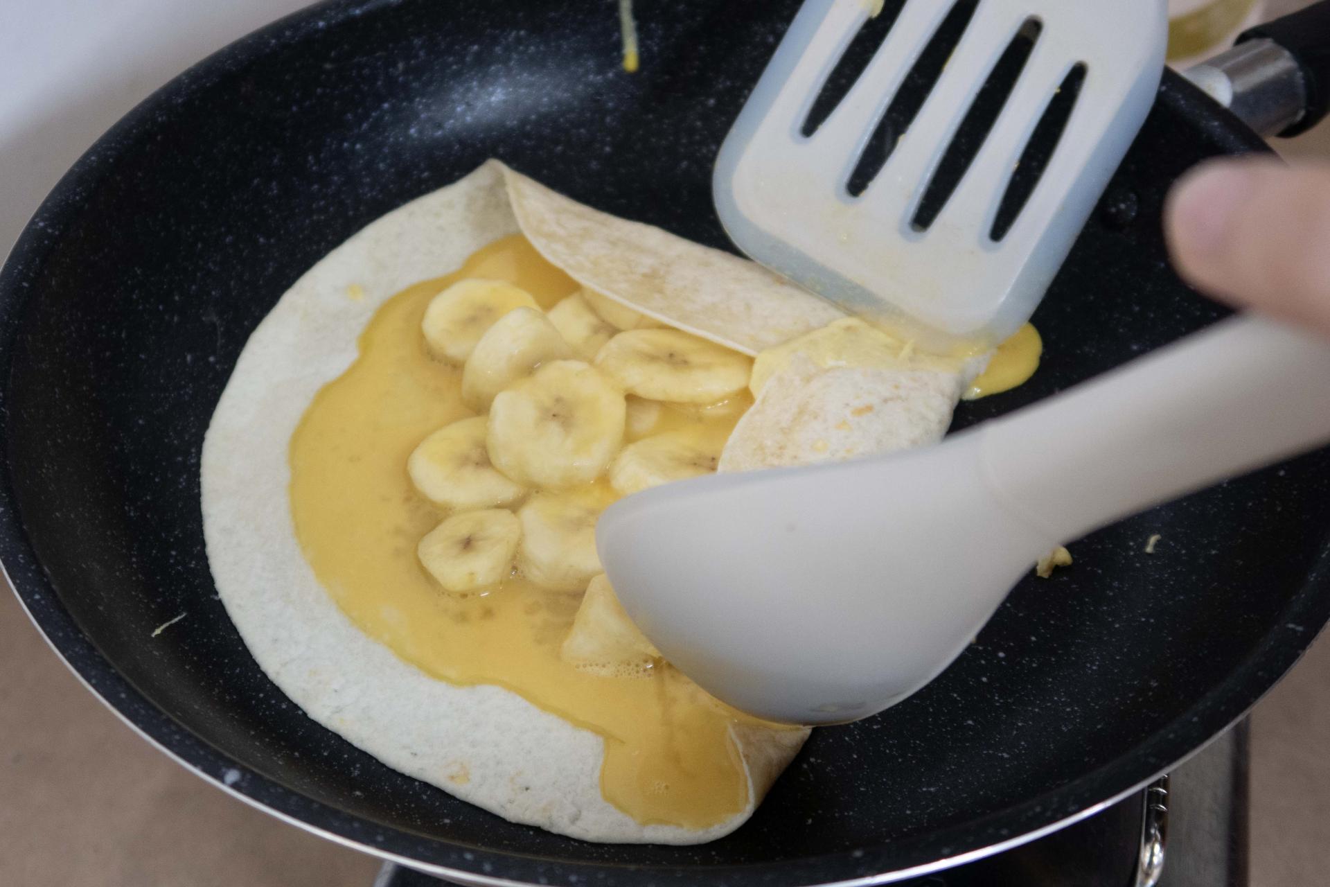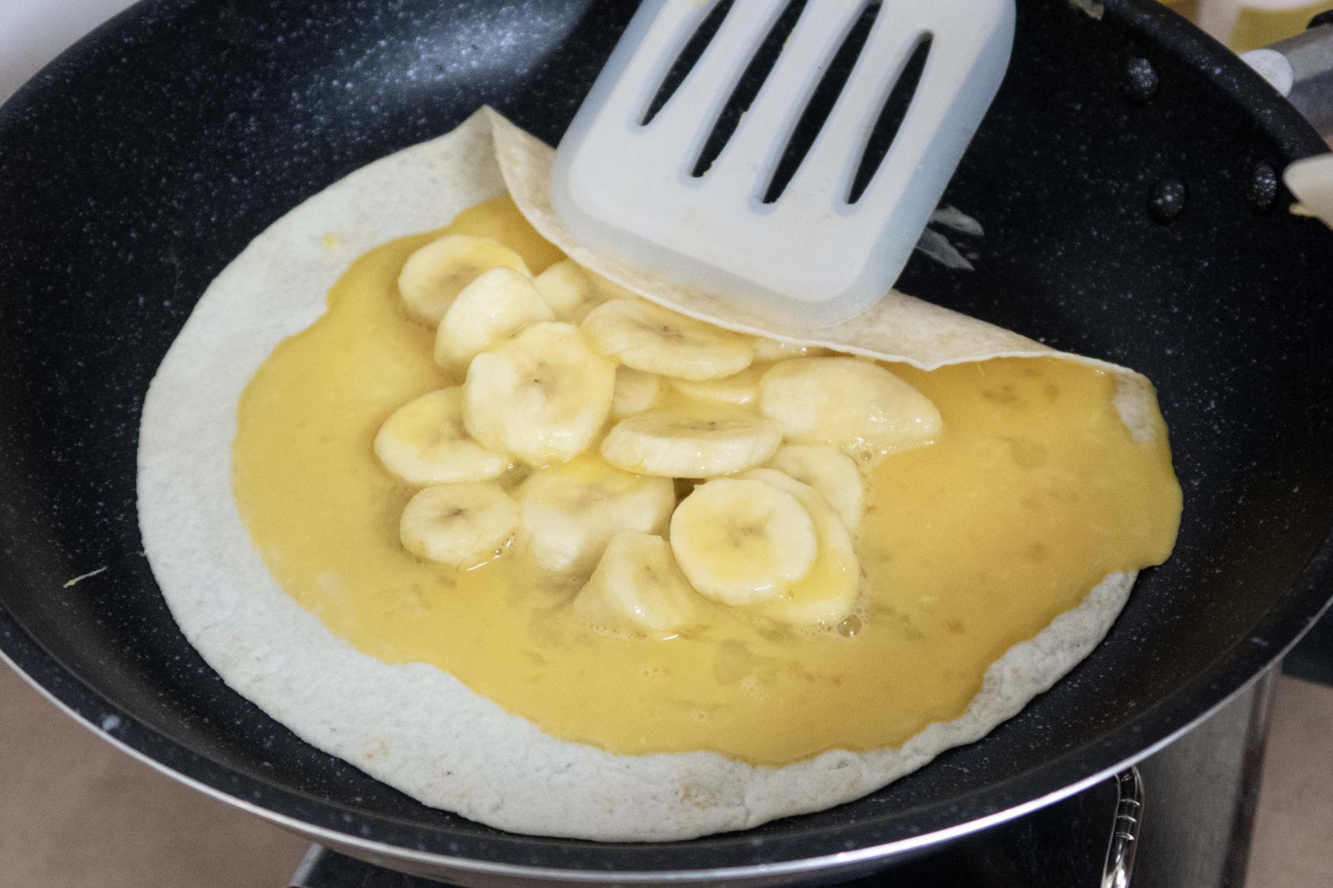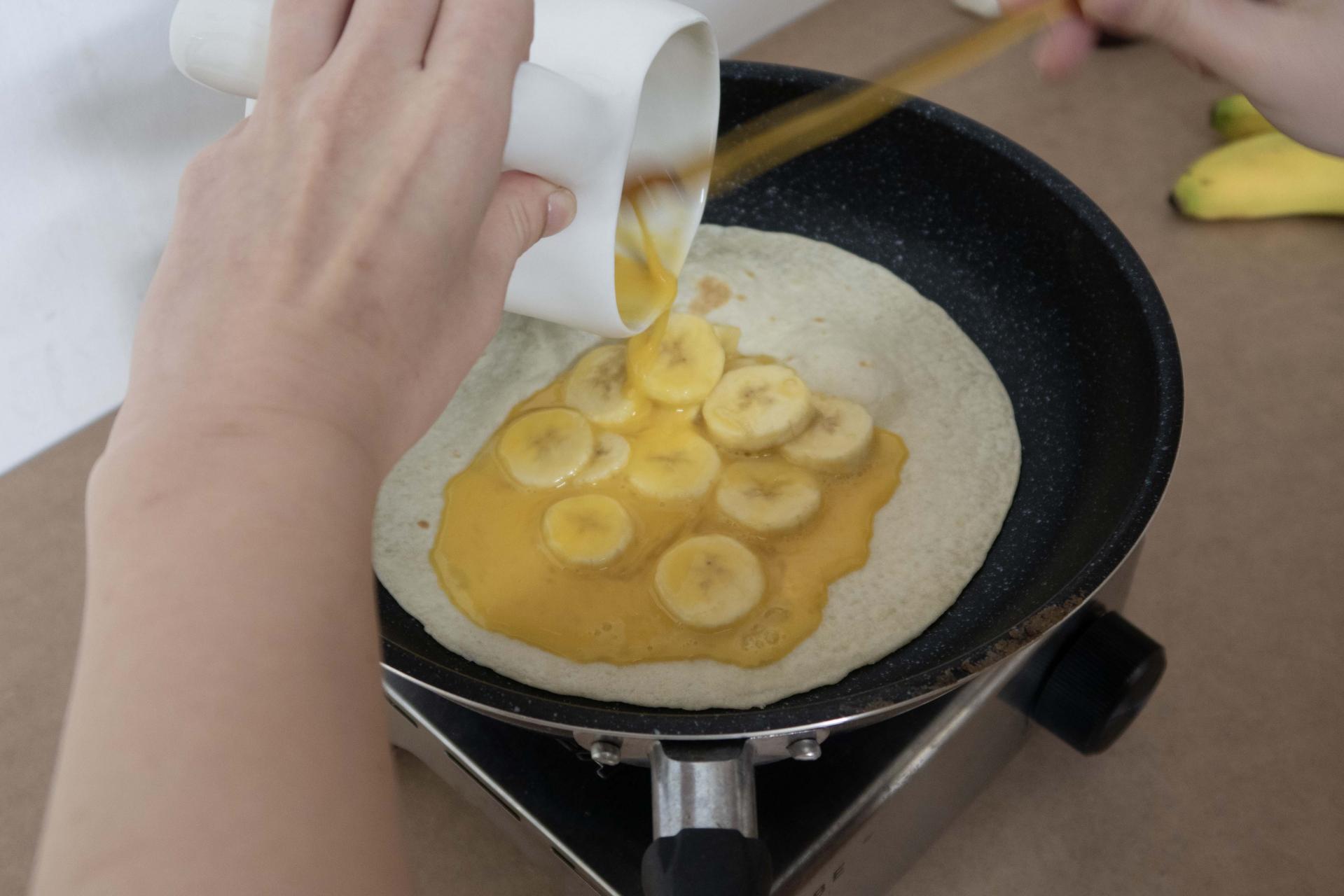 5. 또띠아 중앙 부분으로 계란물과 바나나를 부어줍니다.